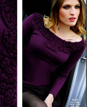 Бежевая (на фото фиолетовая) блуза с широкой горловиной, отделанной шелковистыми цветами. Прекрасный вариант как для офиса - с классическими коричневым брюками, так и для отдыха - с джинсами.