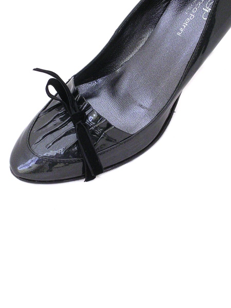 Изумительные туфли-лодочки из натуральной лаковой кожи цвета антрацит. Закрытый вытянутый мысок. Декорированы драпировкой и маленьким, изящным велюровым бантиком черного цвета. Подкладка и подошва изготовлены из натуральной кожи. Невысокий тонкий каблук высотой 7 см.