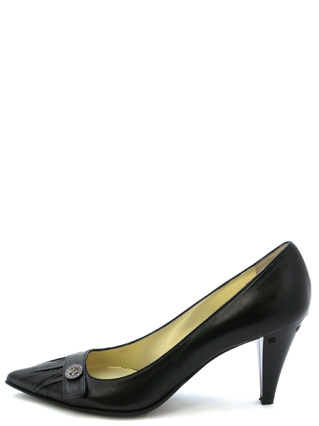 Черные туфли из натуральной кожи, рельефно декорированы, никелевая пряжка. Подкладка из телячьей кожи. Подошва прорезиненная, из натуральной кожи. Каблук тонкий, 5 см.