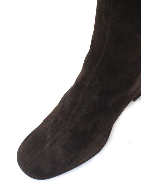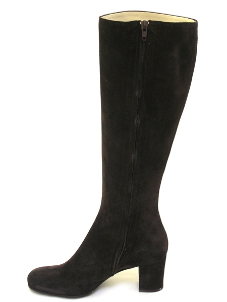Темно-коричневые сапоги из натуральной замши. Сапоги на молнии. Подкладка из кожи светлого цвета. Невысокий устойчивый каблук 6 см высотой. Подошва изготовлена из натуральной кожи с резиновым укреплением. У сапог удобная колодка, ноги не будут уставать.