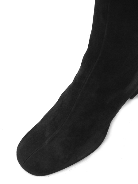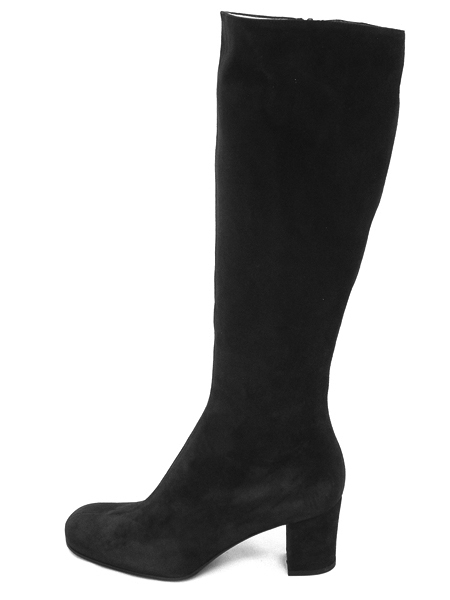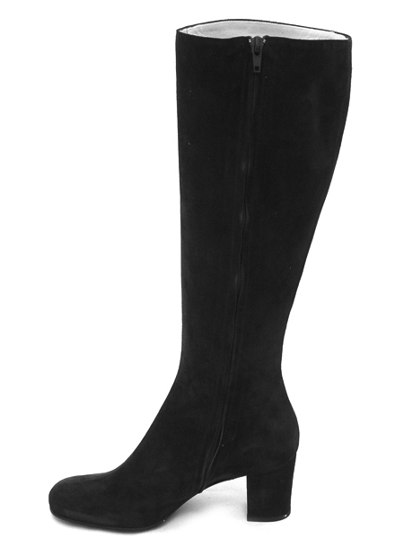 Черные замшевые классические сапоги. Сапоги сбоку застегиваются на молнию. Сапоги на шерстяной подкладке. Невысокий, устойчивый каблук высотой 6 см. Подошва изготовлена из натуральной кожи с резиновым укреплением. Колодка исключительно удобная, мысок округленный.