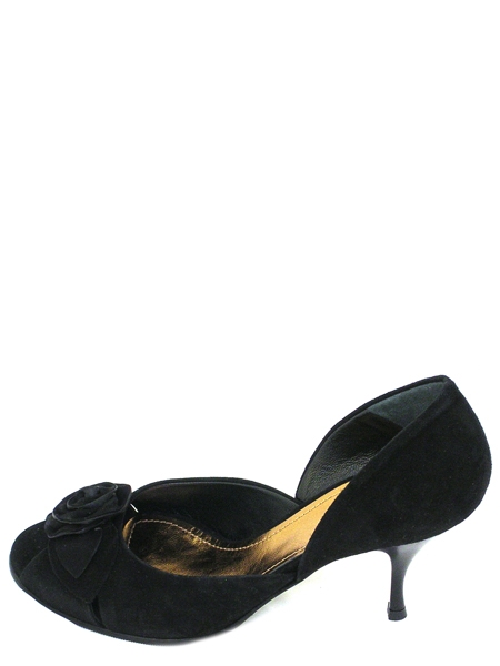 Нарядные туфли из натуральной замшевой кожи. Очень изящная модель на тонком каблуке высотой 8,5 см. Цвет-черный. Подкладка из телячьей кожи. Подошва изготовлена из натуральной кожи. Мысок открытый. Туфли декорированы цветком из замши в цвет модели.
