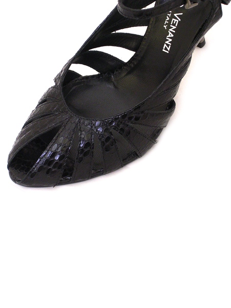 Модные туфли в стиле ретро 50-х. Хит сезона 2008-2009. Интересный открытый дизайн туфель с тиснением под кожу питона черного цвета. Подкладка из телячьей кожи. Подошва изготовлена из натуральной кожи с резиновым укреплением. Высокий каблук "рюмочкой" высотой 9 см искусственно состарен "царапинами". Модель на ремешке.
