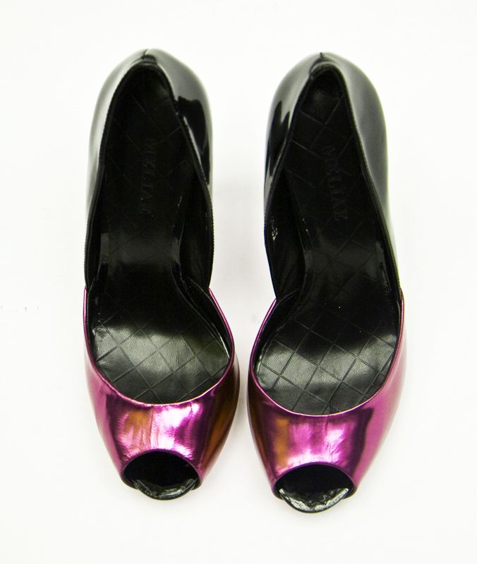 Элегантные туфли на шпильке, выполнены из натуральной лаковой кожи розового и черного цвета.