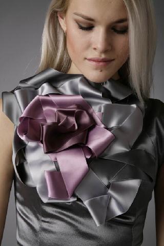 Модель приталенная, лиф декорирован неподражаемым цветком из шелковых лент.