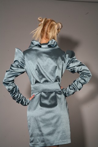 Платье с объёмным воротом-стойкой, ворот сзади декорирован, рукава удлинённые, присобранные до отворотов на плече. Силуэт строгий, талия подчёркнута широким поясом.