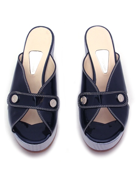 Оригинальные сабо выполнены в морском стиле - насыщенная темно-синяя лакированная кожа в сочетании с бело-синими полосками. Мысок украшен металлическими заклепками. Удобная колодка. Идеально подойдут для отпуска и выходных прогулок. Сочетается как с джинами, шортами, так и с юбками в спортивном стиле. В комплекте запасные набойки.