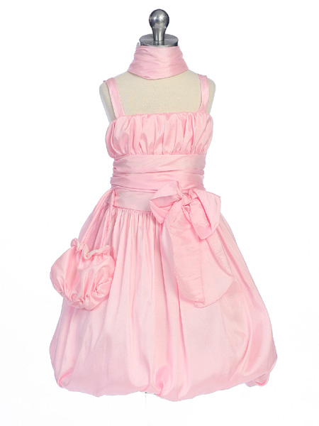 Спереди и сзади платье украшено бантами и дополнено накидкой с коротким рукавом и сумочкой-кисетом.