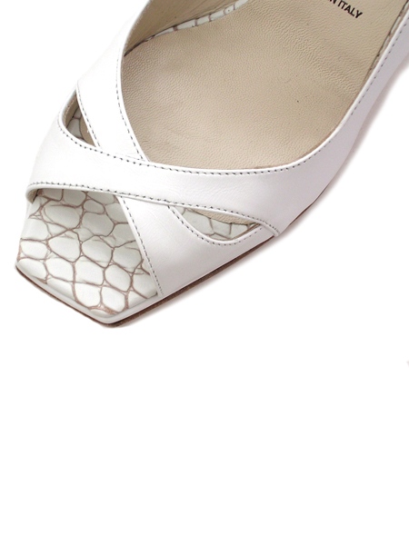 Модные летние босоножки из мягкой молочной кожи с имитацией под крокодила, с квадратным открытым мысом и устойчивым каблуком. Выполнены в стиле 70-х.