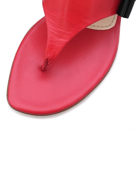 Эффектные, стильные и яркие босоножки-вьетнамки насыщенного алого оттенка на низком каблуке. Модная геометричность форм подчеркнута оригинальной пряжкой-трубочкой. Легкие, удобные и практичные.