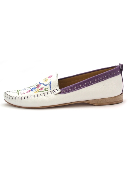 Мягкие и удобные мокасины молочного оттенка с декоративной яркой вышивкой ручной работы. Колодка на стандартную полноту. Идеально подойдут к любому цветовому наряду.