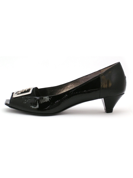 Комфортные и легкие туфли классического черного цвета на низком устойчивом каблуке. Впорная и удобная колодка, мыс квадратный и открытый. Спереди металлическая пряжка с названием производителя.