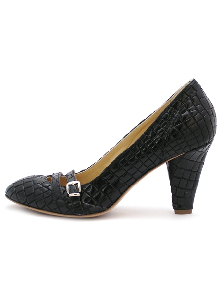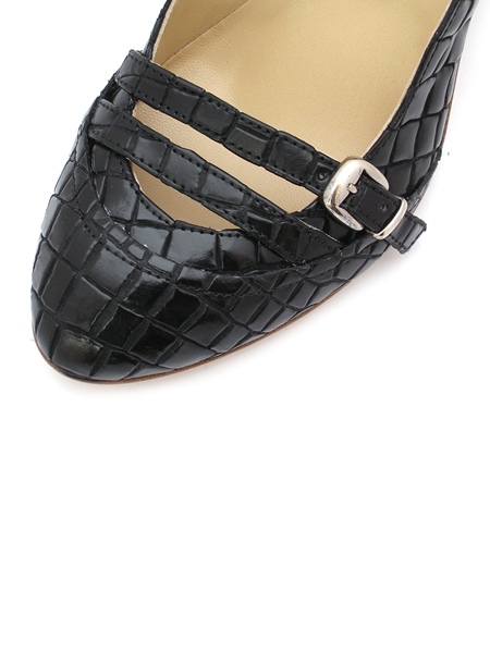 Стильные, модные и оригинальные туфли классического и универсального черного цвета с имитацией под кожу питона и обтяжным каблуком. Аккуратный, слегка заостренный мыс, спереди туфли декорированы ремешками. Каблук не слишком высокий, удобный и устойчивый.