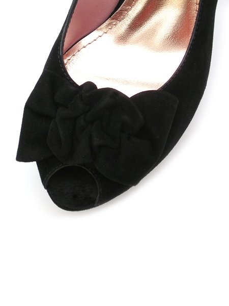 Милые женственные туфли-лодочки глубокого черного цвета. Мыс открытый, декорирован розочкой из замши в тон. Колодка удобная, каблук устойчивый. Утонченная и изящная модель.