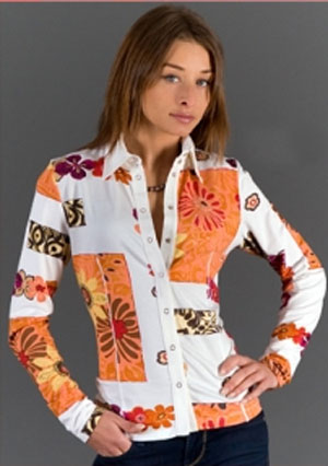 с отложным воротничком и цветочным рисунком.
