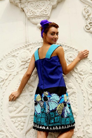 Платье выполнено из яркой ткани с купоном, присборенной спереди, верх - плечики с оригинальным вырезом из насыщенной бирюзовой ткани.
