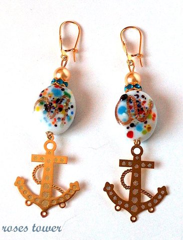 Стеклянные бусины, расписанные вручную, стразы, жемчуг Сваровски, синтетический кощачий глаз, металлическая и позолоченная фурнитура (подвески, замочек и швензы).