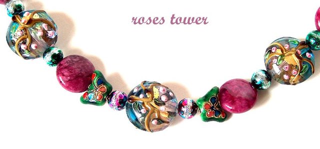 Муранское стекло, крашенный авантюрин, эмалевые бусины, стекло, позолоченный замочек.