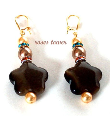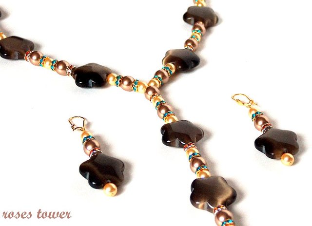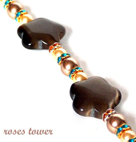 Золотой и бронзовый жемчуг Сваровски, синтетический кошачий глаз, стразы, позолоченная фурнитура.
