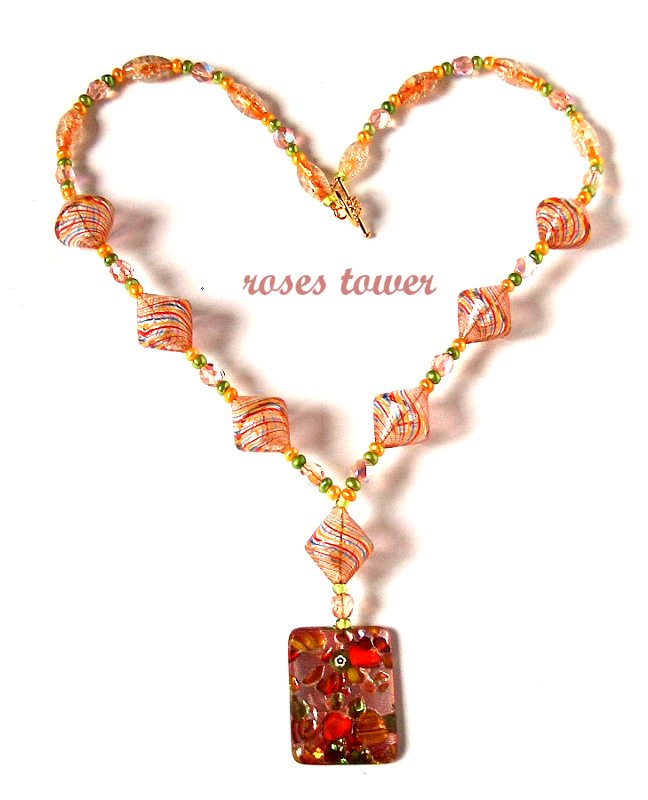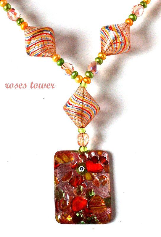 Кулон в муранском стиле, полые стеклянные бусины, крашенный речной жемчуг, чешское стекло, позолоченный замочек.