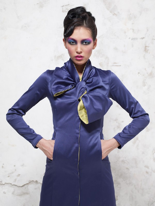 Платье-плащ с внутренней еврообработкой швов выполнено в сдержанном, аккуратном стиле, т.к. практически не заметен ряд застежек. Стойка-воротник переходит в эффектный крупный бант с желтыми вставками. По бокам плаща присутствуют карманы.