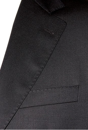 Вспушка по краю борта, лацканам и клапанам карманов. Подборт прямой с кантом. Брюки с 1 складкой.