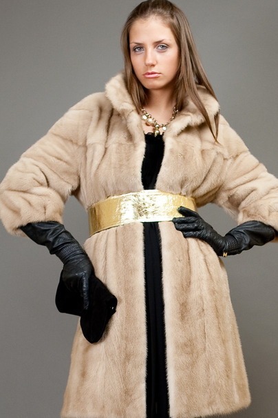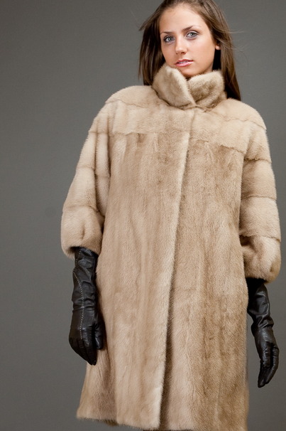 Шуба не крашеная, выполненная из меха североамериканской норки редкого нежного персиково-кремового оттенка.