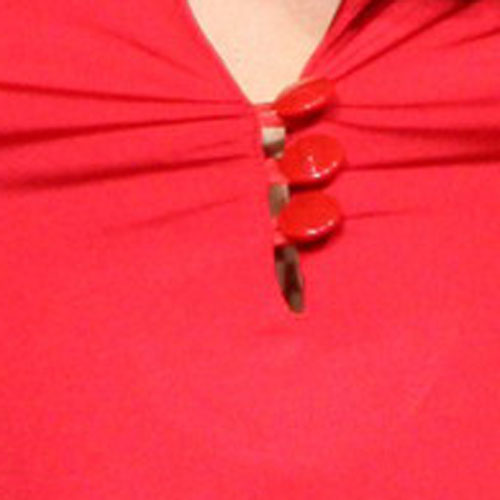 Глубокий узкий вырез горловины внизу застегивается на маленькие пуговки, что придает пикантность модели.