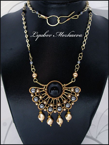 Подвеска на цепочке, выполнена из проволоки латунной и позолоченной 24К, жемчуга и кристаллов Swarovski, черного агата.