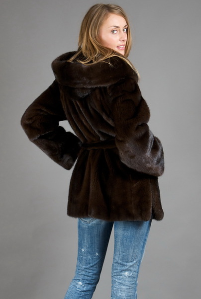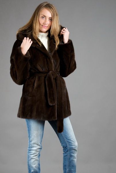 Норковая шуба дополнена двусторонним капюшоном и роскошным пояском из меха.