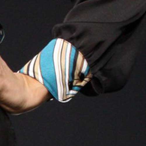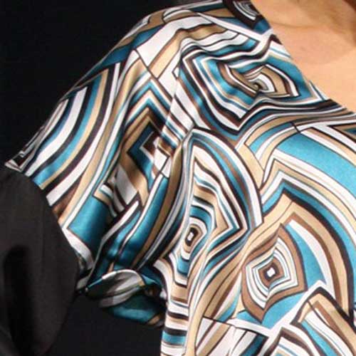 Юбка и нижняя часть рукава выполнены из ткани контрастного черного цвета.