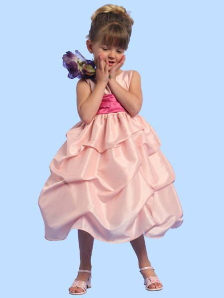 Нарядное детское бальное платье с оригинальной отделкой. Модель выполнена из белого атласа с легким кремовым оттенком. По линии талии проходит широкий пояс, контрастного красного цвета. По левому боку пояс украшен большим атласным бантом в виде красной розы с лепестками с красной шифоновой вставкой. Вырез горловины платья круглый, и отстрочен узкой отделочной строчкой. Пройма рукава обработана также. Платье длинное, длиною чуть выше щиколоток. По юбке модель присобрана широкими ломаными горизонтальными складками, что создает дополнительный объем.