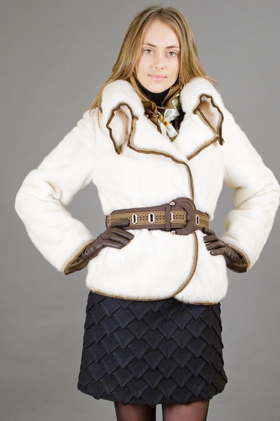 Укороченная норковая шубка-автоледи с большим отложным воротником.
