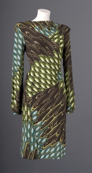 Платье из нежного вискозного трикотажа в зеленоватой гамме с рисунком, напоминающим оперение влшебной птицы.