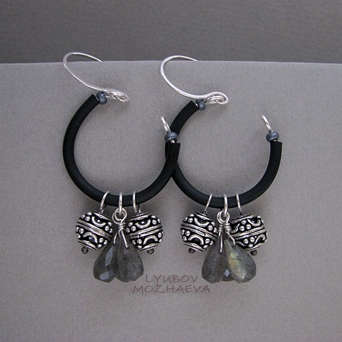 Серьги выполнены из посеребренной проволоки, серебряных бусин ручной работы, лабрадора и каучука.