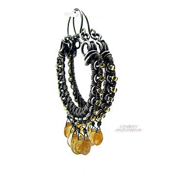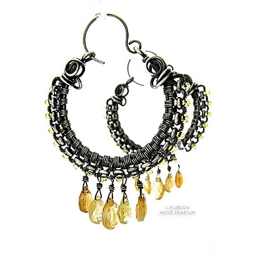 Серьги выполнены из посеребренной проволоки, цитрина и бисера.