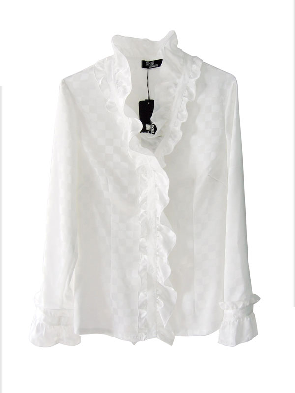 Офисная блуза классической длины из атласной ткани в оригинальном исполнении: немного расклешённый в манжете рукав, вырез горловины оформлен рюшей, переходящей в обтачку полочки. Застёжка на мелкие перламутровые пуговицы. Модель выполнена из ткани "клетка": матовые клеточки чередуются с атласными. Вытачки на полочке и спинке образуют приталенный силуэт и обеспечивают комфортную посадку по фигуре.