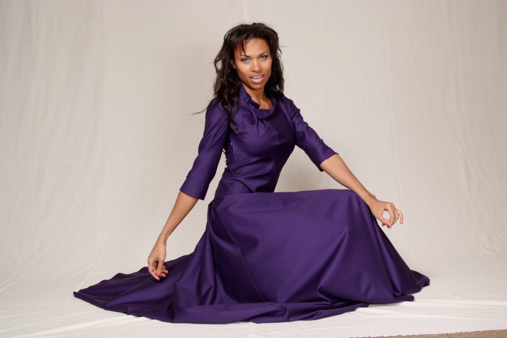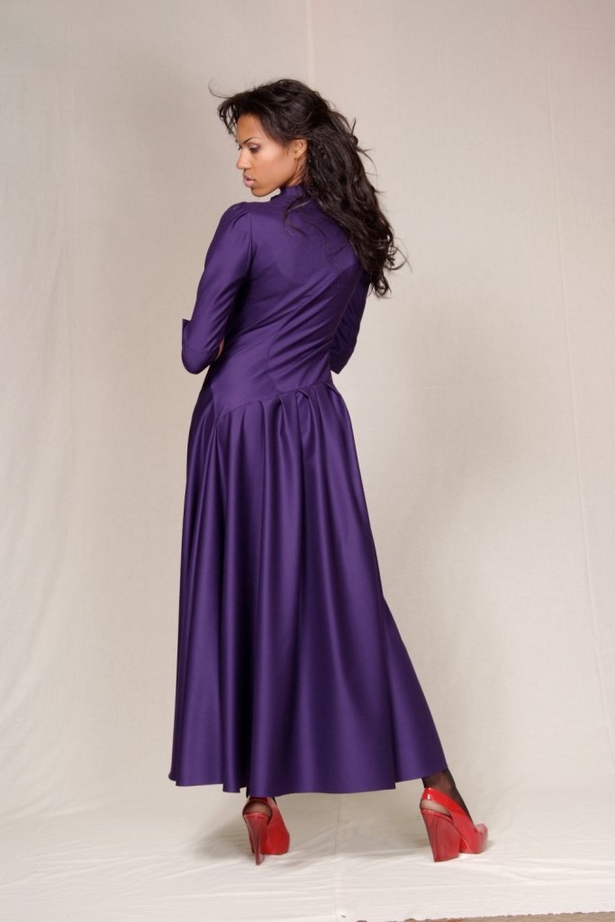 Длинное платье насыщенного фиолетового цвета ассиметричного покроя - сказочно красивый наряд для особого случая. Модель, оформленная необычной формы воротничком и манжетами, с рукавом 3/4 и оригинальными защипами, излучает сияние и имеет по-настоящему благородный вид! Скроенное по "косой", это платье необычайно выигрышно рисует силуэт и представляет вас в самом роскошном свете!