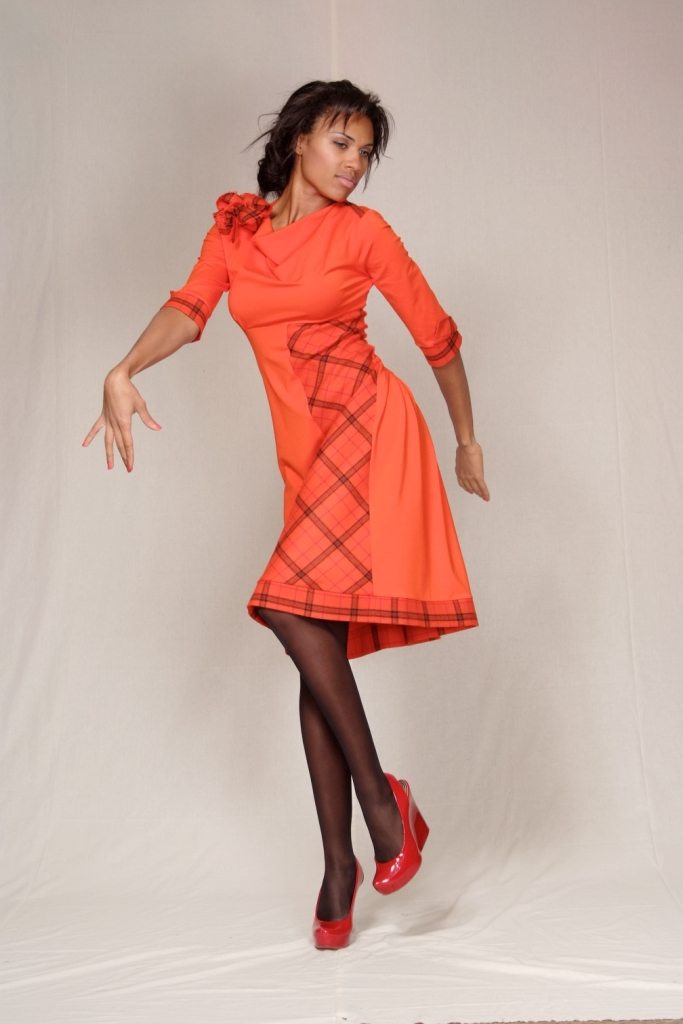 Стильная, дерзкая и динамичная модель, созданная для яркой леди! Облегающий верх с мягко драпированым воротничком, рукавом 3/4 и расклешённая юбка - само очарование. Особую выразительность модели придаёт игра фактур основной ткани и отделки манжет и низа изделия.