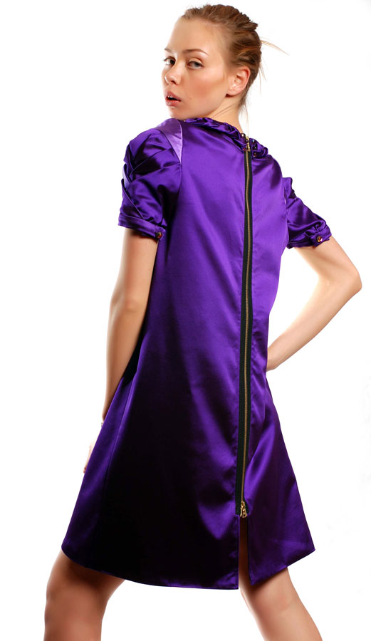 Необыкновенно яркое, фиолетовое платье свободного силуэта. Смелое дизайнерское решение: интересный рукав сплетённый косой и украшающий горловину декор - коса. Благодаря своему свободному покрою платье подойдёт на любую фигуру, а настроченная молния по середине спинки даёт возможность регулировать высоту разреза, который придаст пикантность вашему образу.
