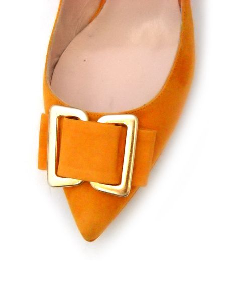 Изящные босоножки итальянской марки GRIFF ITALIA, выполненные из натуральной замши цвета шафрана с классическим острым носом, с декоративной металлической пряжкой. Невысокий устойчивый каблук (7,5), обтянутый замшей станет идеальным вариантом для ежедневного ношения. Ярко-оранжевый цвет придаст вам положительных эмоций и хорошего настроения в любую погоду.