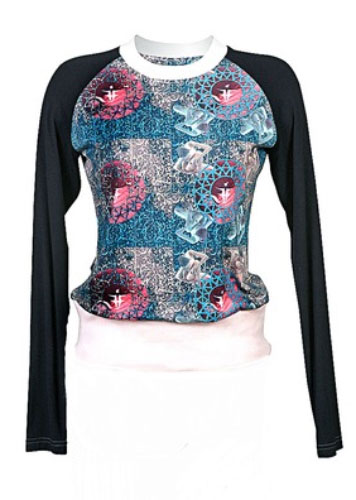 Длинный рукав и удачный покрой (на талии обтягивает, к низу расходится. Дизайн футболки действительно уникален, вы сможете носить ее и с джинсами, и с брюками, и с шортами и даже, с юбкой. Ведь это одежда от Lena Karin, коллекция весна-лето 2010 под названием «Блюканари. Улитка на склоне»