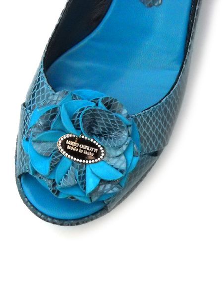 Босоножки из натуральной кожи с выделкой под кобру итальянской люксовой марки MARIO CERUTTI. Предельно простая форма туфелек (аккуратный вырез для пальчиков, открытая пятка) делает их практичными и удобными в ношении.Главный акцент обуви - декоративная розочка, которая придает некий романтизм и игривость.Насыщенный бирюзовый цвет сделают вас модной и неотразимой в летнюю пору.