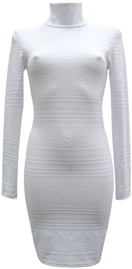 Белое трикотажное платье-водолазка с рисунком из коллекции BLACK&WHITE / LUXURY. У белых нарядов есть одно отличное свойство – с ними прекрасно сочетаются обувь и сумки ярких цветов.