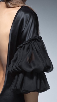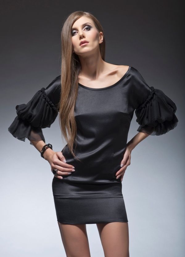 Вечернее короткое коктейльное платье с глубоким вырезом на спине и пышными рукавами из шифона. С таким нарядом можно не волноваться, вы будете в центре внимания весь вечер. Модель из коллекции BLACK&WHITE / LUXURY.