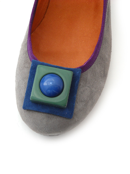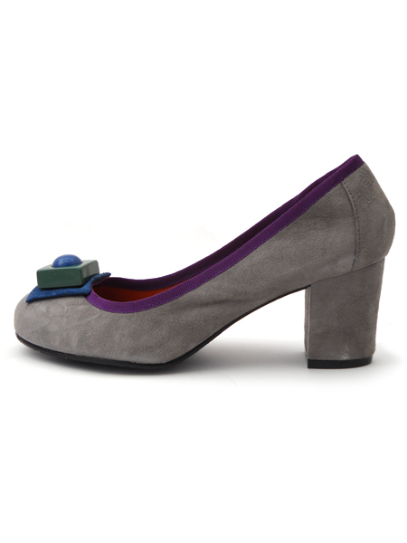 Симпатичные замшевые туфельки из новой коллекции. Строгий серый цвет разбавлен ярким фиолетовым кантом и ярким пластиковым украшением на мыске. Удобная колодка, оптимальная высота каблука и округлый мыс делают эти туфли незаменимым помощником в вашей офисной жизни.