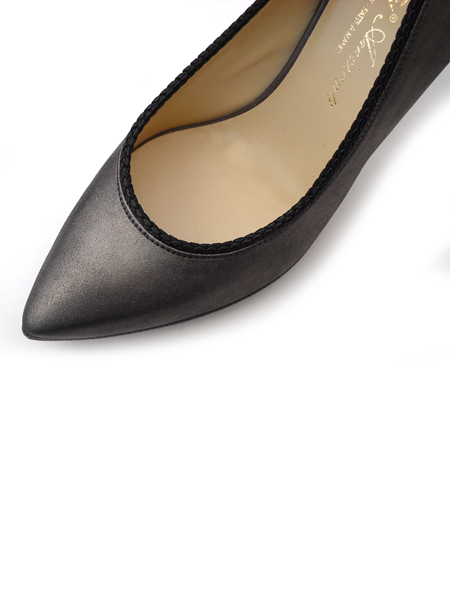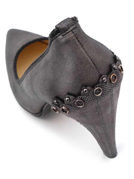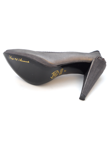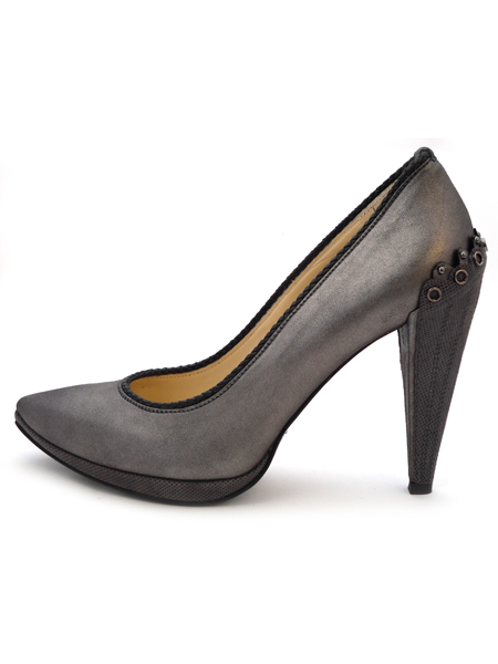 Благородный цвет темного серебра, темная оторочка , напоминающая кружево делают модель одновременно и строгой и очень женственной. Каблук выполнен в той же цветовой гамме с имитацией кожи угря, переход от каблука к самой туфельке оформлен клепками.