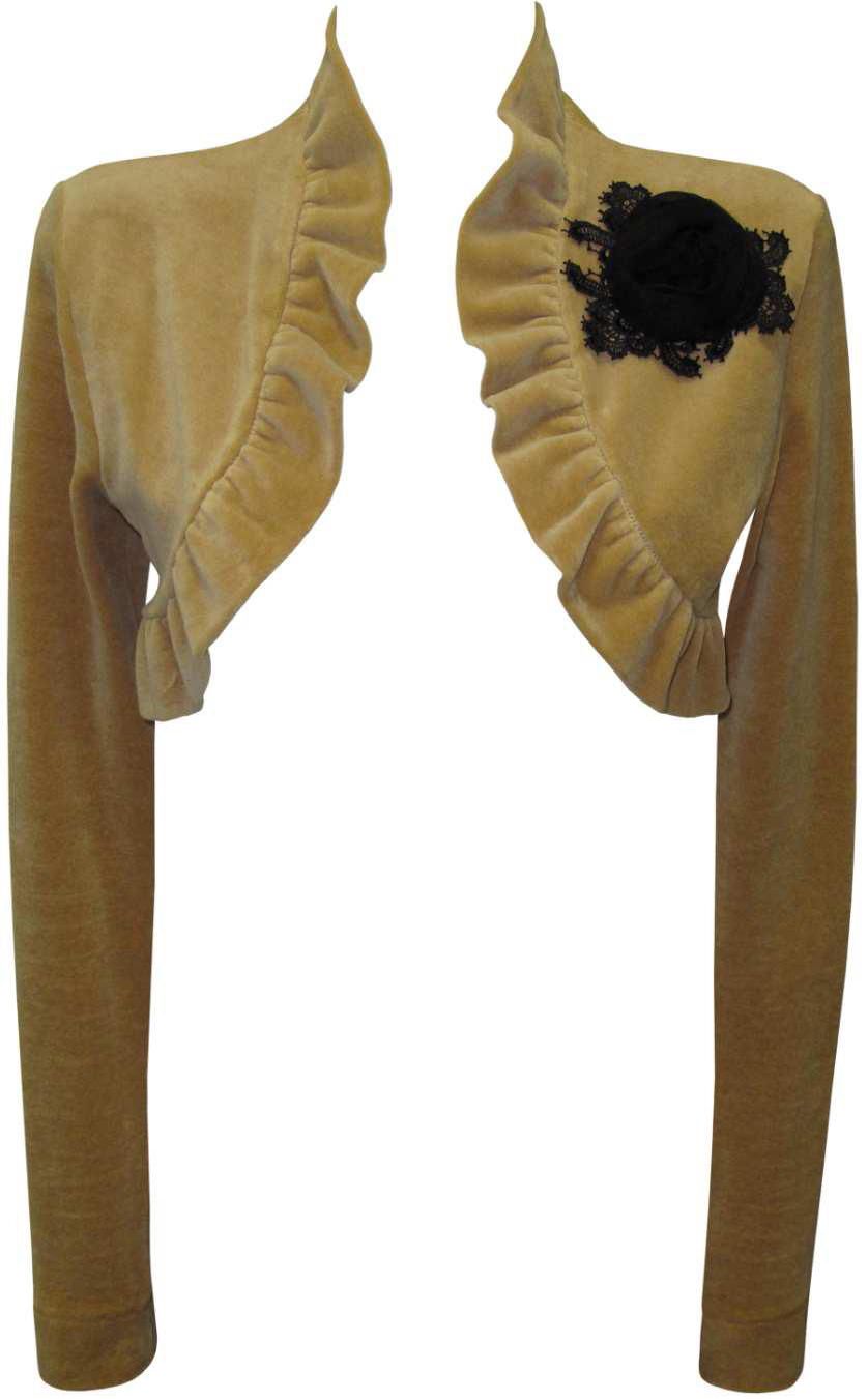 Золотое болеро с длинными рукавами, воротник и края отделаны рюшами. Наряд уже с готовым аксессуаром кружевной цветок напоминает брошь. Созданный дизайнером образ утонченной, стильной женщины, вы можете дополнить, выбрав брюки из этой же коллекции. Модель из коллекции Рaris.