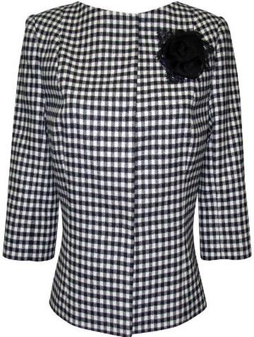 Белый приталенный жакет в черную клетку с рукавами 3/4 идеально подойдет к любому низу и дополнит любое платье. Наряд уже с готовым аксессуаром кружевной цветок напоминает брошь. Созданный дизайнером образ утонченной, стильной женщины, вы можете дополнить, выбрав юбку карандаш из этой же коллекции. Модель из коллекции Рaris.