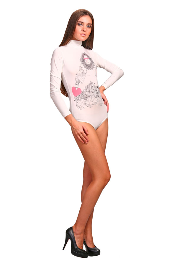 Стильное боди с длинными рукавами, воротником-стойкой и с оригинальным принтом будет отлично сочетаться с джинсами или темными брюками (причем как классического, так и нестандартного покроя). Стоит изменить одну составляющую, как боди становится элементом стиля casual, выходной торжественной вещью или составляющей гардероба неформальной молодежи.
